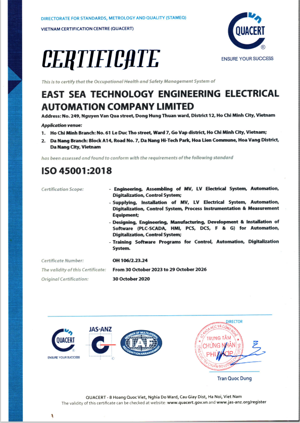 - Năm 2023 ESTEC tiếp tục được các chuyên gia đánh giá và tái cấp chứng chỉ ISO 45001 có hiệu lực từ 30/10/2023-29/10/2026.