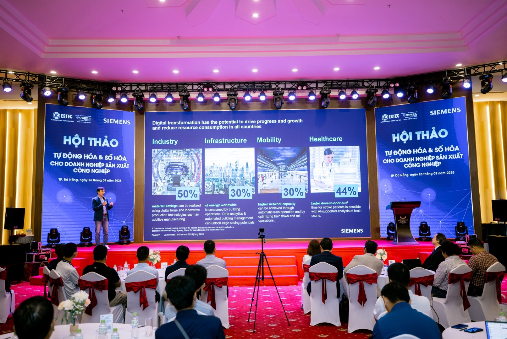 Ngày 26/09/2025, tại thành phố Đà Nẵng, Công ty ESTEC phối hợp cùng Siemens Việt Nam, với sự hỗ trợ kết nối doanh nghiệp từ Ban Quản lý Khu Công nghệ cao & các Khu công nghiệp Đà Nẵng, đã tổ chức thành công Hội thảo “TỰ ĐỘNG HÓA & SỐ HÓA CHO DOANH NGHIỆP SẢN XUẤT CÔNG NGHIỆP”. Sự kiện đã thu hút sự quan tâm đặc biệt của các Quý Lãnh đạo, các cấp quản lý và chuyên gia từ nhiều doanh nghiệp sản xuất trong khu vực.